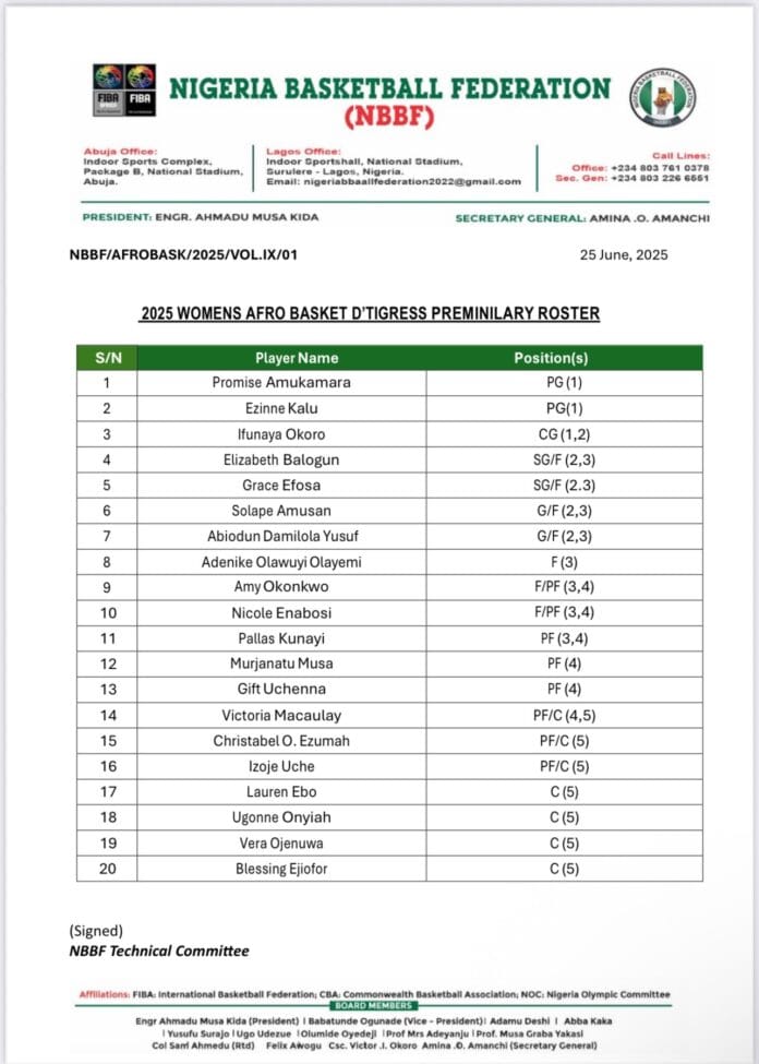 The Nigeria Basketball Federation (NBBF) has unveiled a 20-player provisional squad for the 2025 FIBA Women’s Afrobasket Championship scheduled to take place in Ivory Coast this summer.