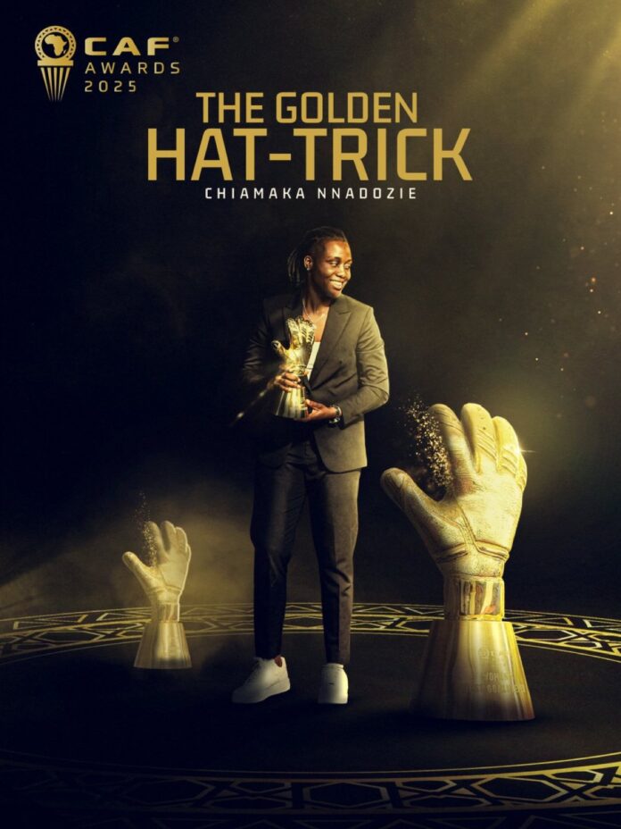 Nigeria’s Super Falcons goalkeeper Chiamaka Nnadozie has been crowned the Women’s Goalkeeper of the Year at the 2025 CAF Awards held on Wednesday night in Rabat, Morocco.