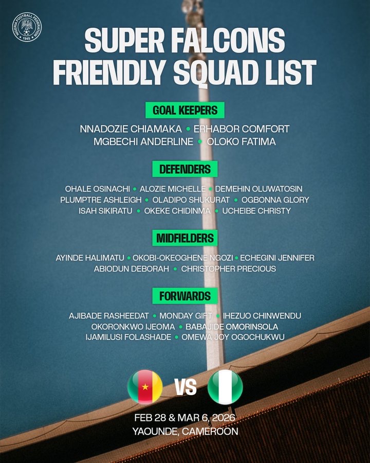 Head coach Justin Madugu has named a 25-player squad for the Super Falcons’ international friendly double-header against Cameroon women’s national football team in Yaoundé.