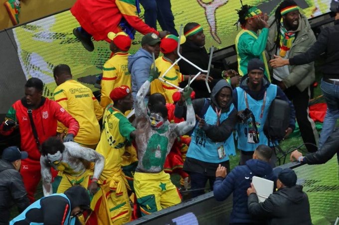 Senegalese fans were accused of involvement in a pitch invasion, violence against security forces, and damage to facilities amid crowd surges and chaos.