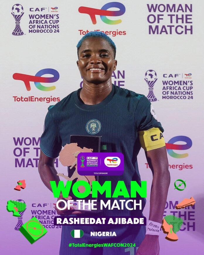 Super Falcons captain Rasheedat Ajibade was named Woman of the Match following her outstanding display in Nigeria’s hard-fought victory over Botswana at the 2024 Women’s Africa Cup of Nations.