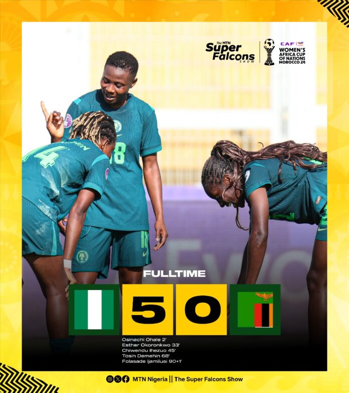 Nigeria’s Super Falcons underlined their status as title contenders at the 2024 Women’s Africa Cup of Nations with a dominant 5-0 victory over Zambia to book their place in the semi-finals.